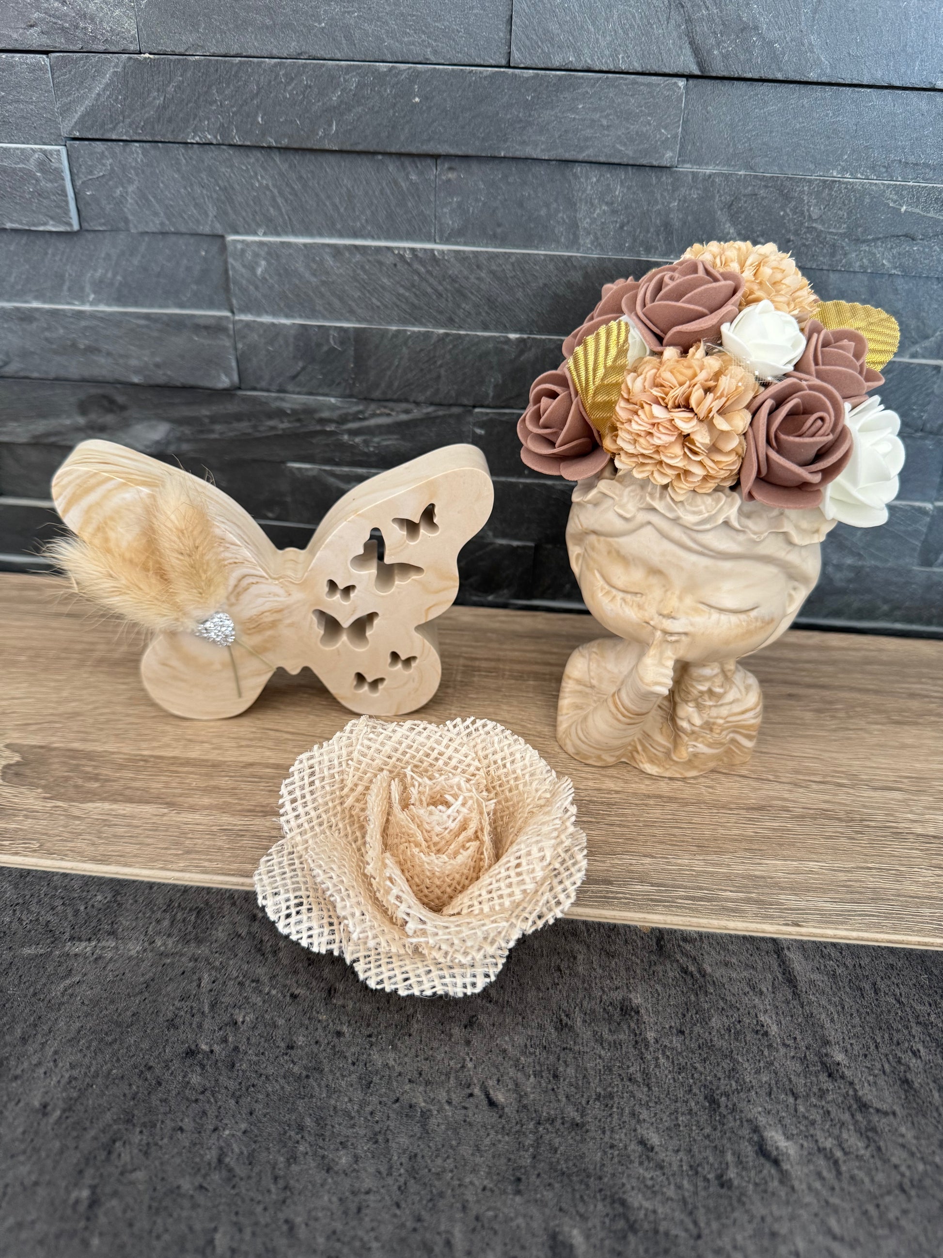 Offrez-vous un magnifique buste en jesmonite fait main avec une composition florale assortie. Fait avec amour et passion, cette pièce unique sera un ajout élégant et raffiné à votre décor. Faites-vous plaisir avec cette création de qualité et laissez-vous inspirer par sa beauté florale.