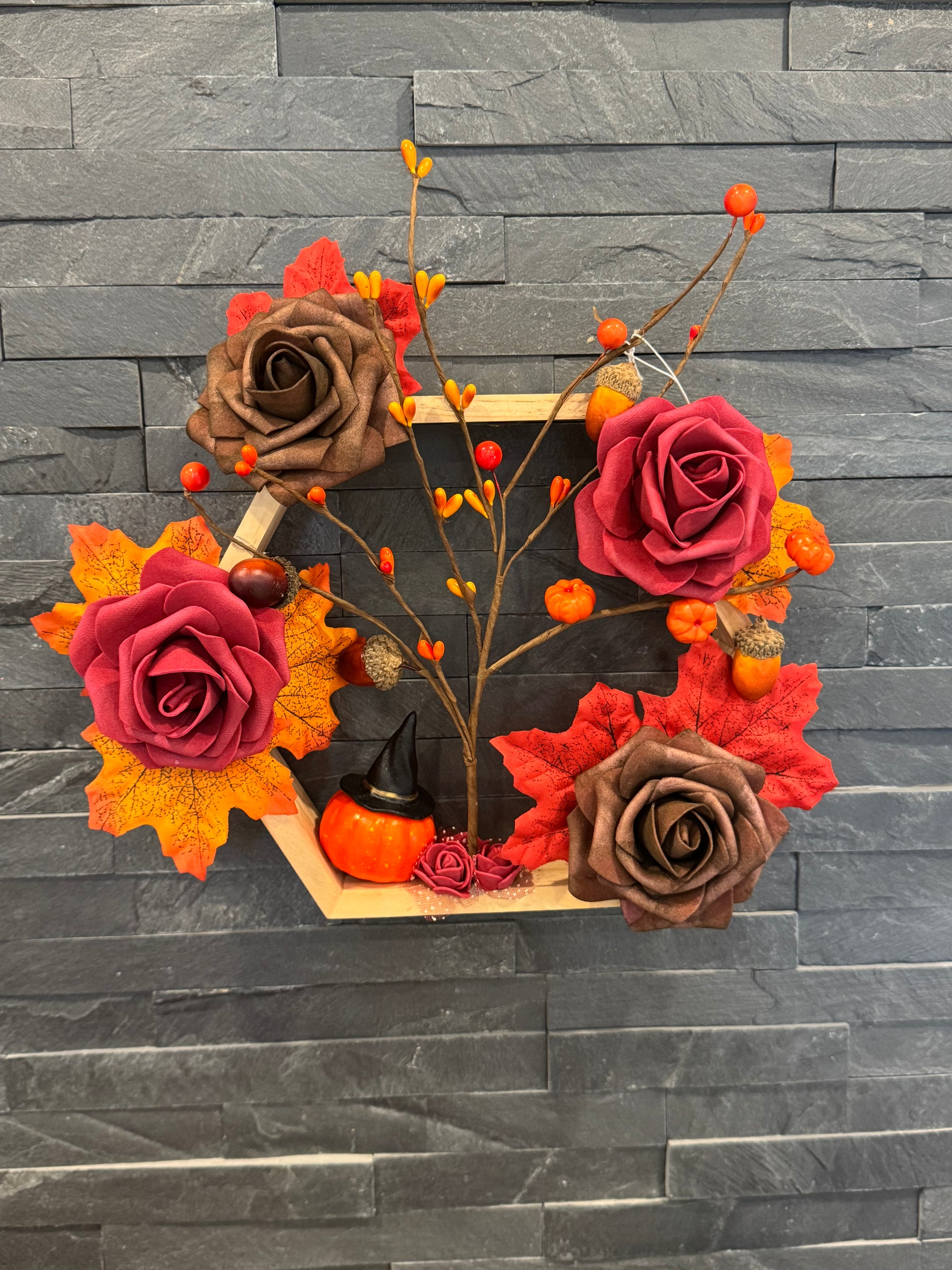 Apportez chaleur et originalité à votre intérieur avec cette décoration murale artisanale en forme d’hexagone, habillée de fleurs artificielles et d’éléments automnaux.