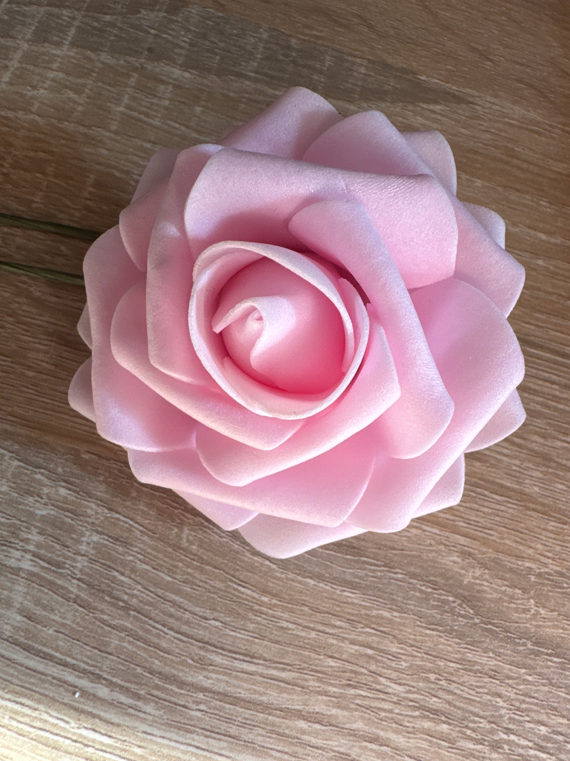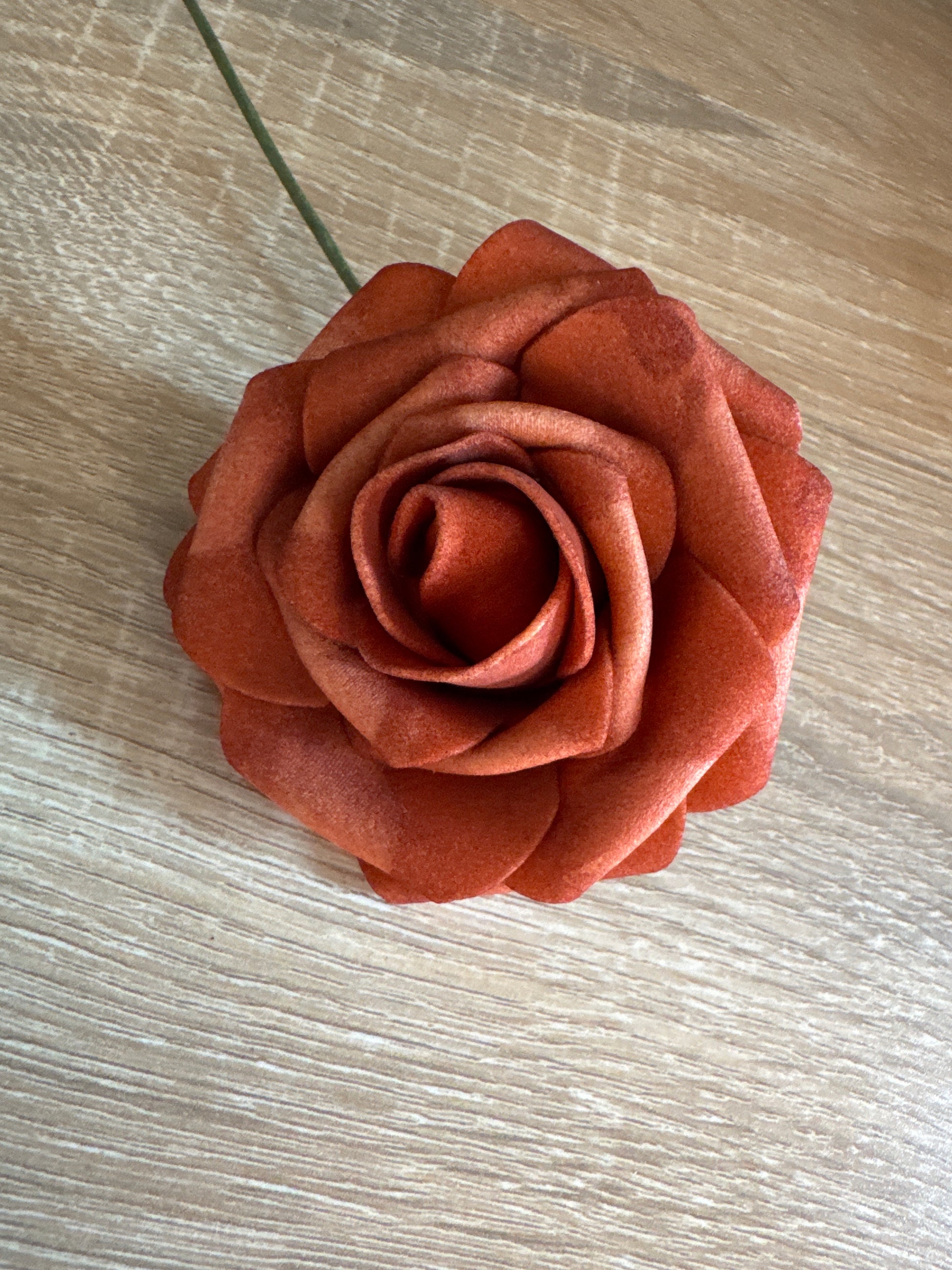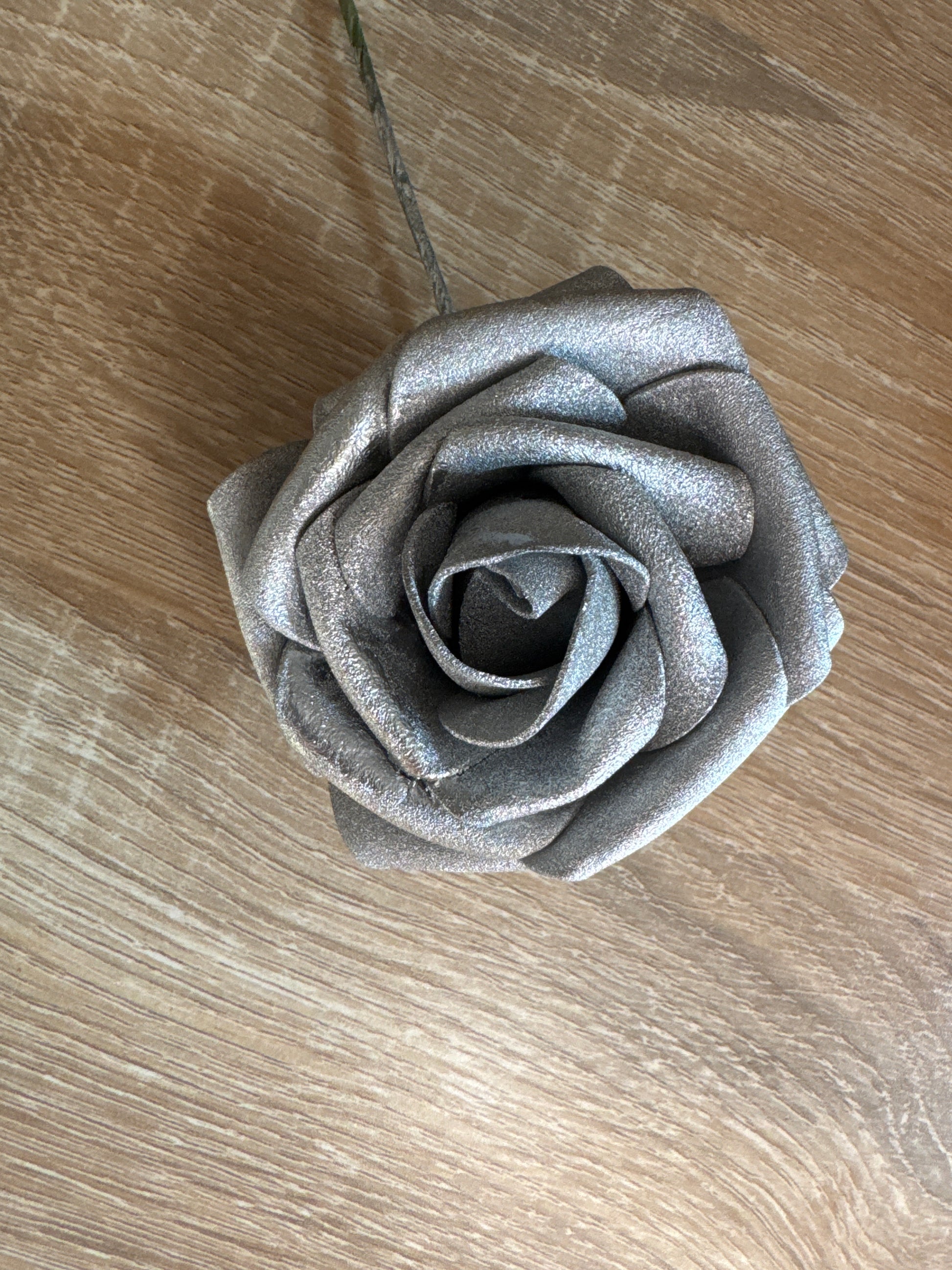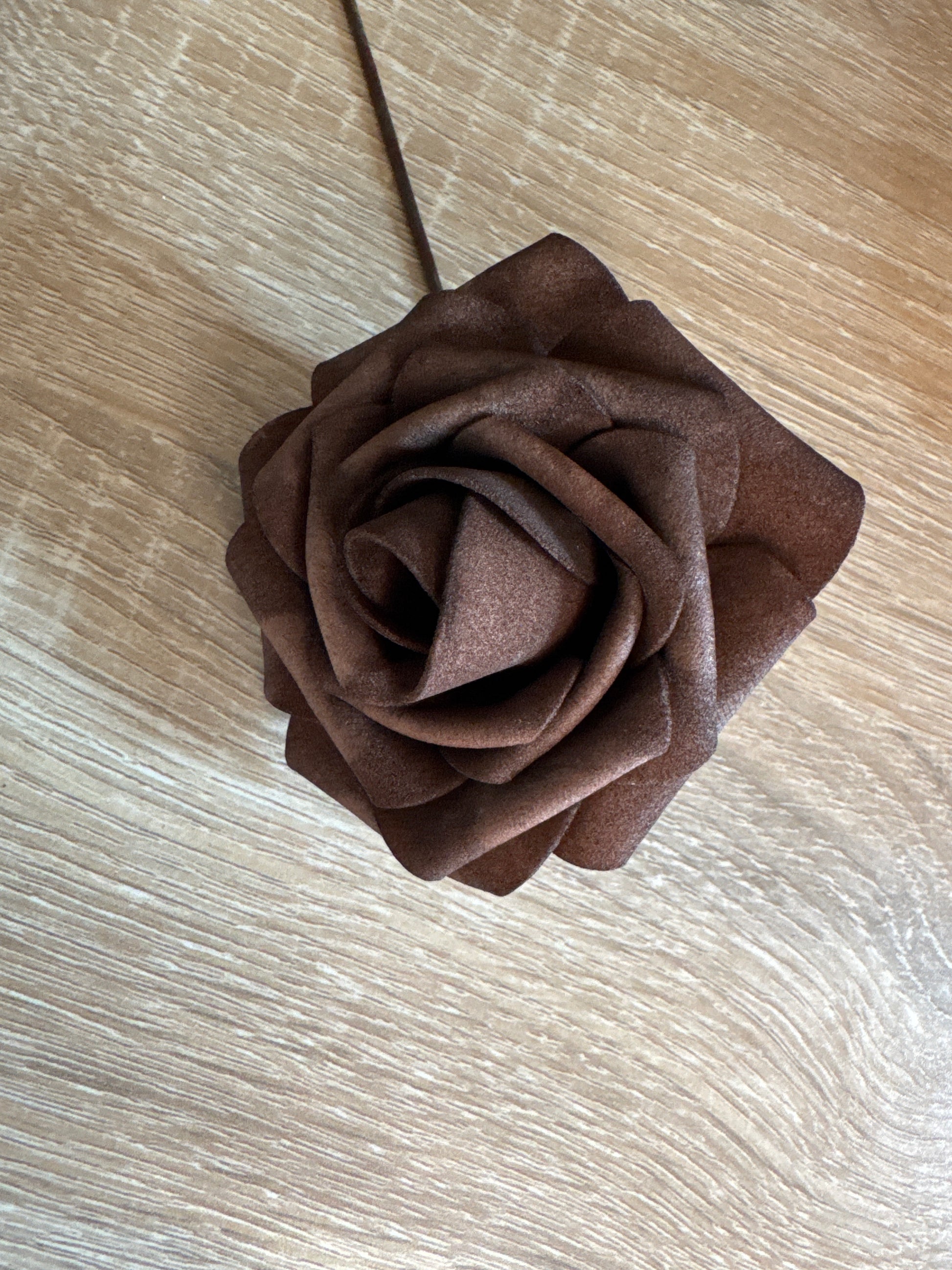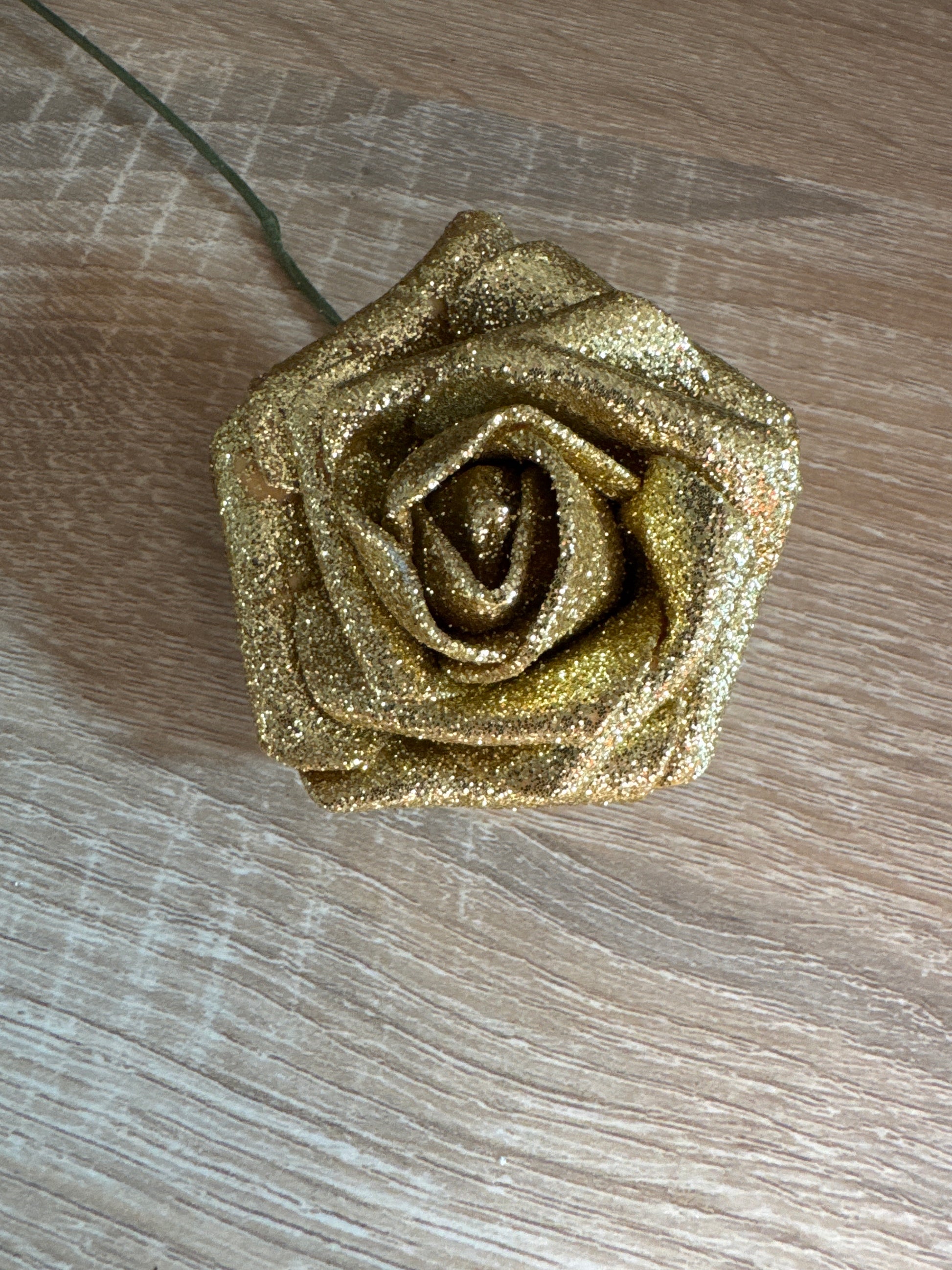 - Matériaux : rose en mousse, éléments décoratifs, tige et feuille synthétique