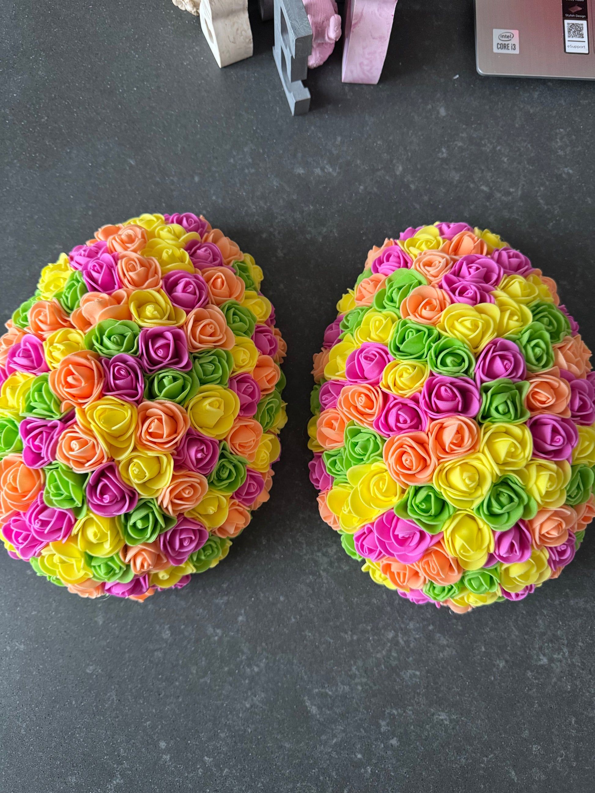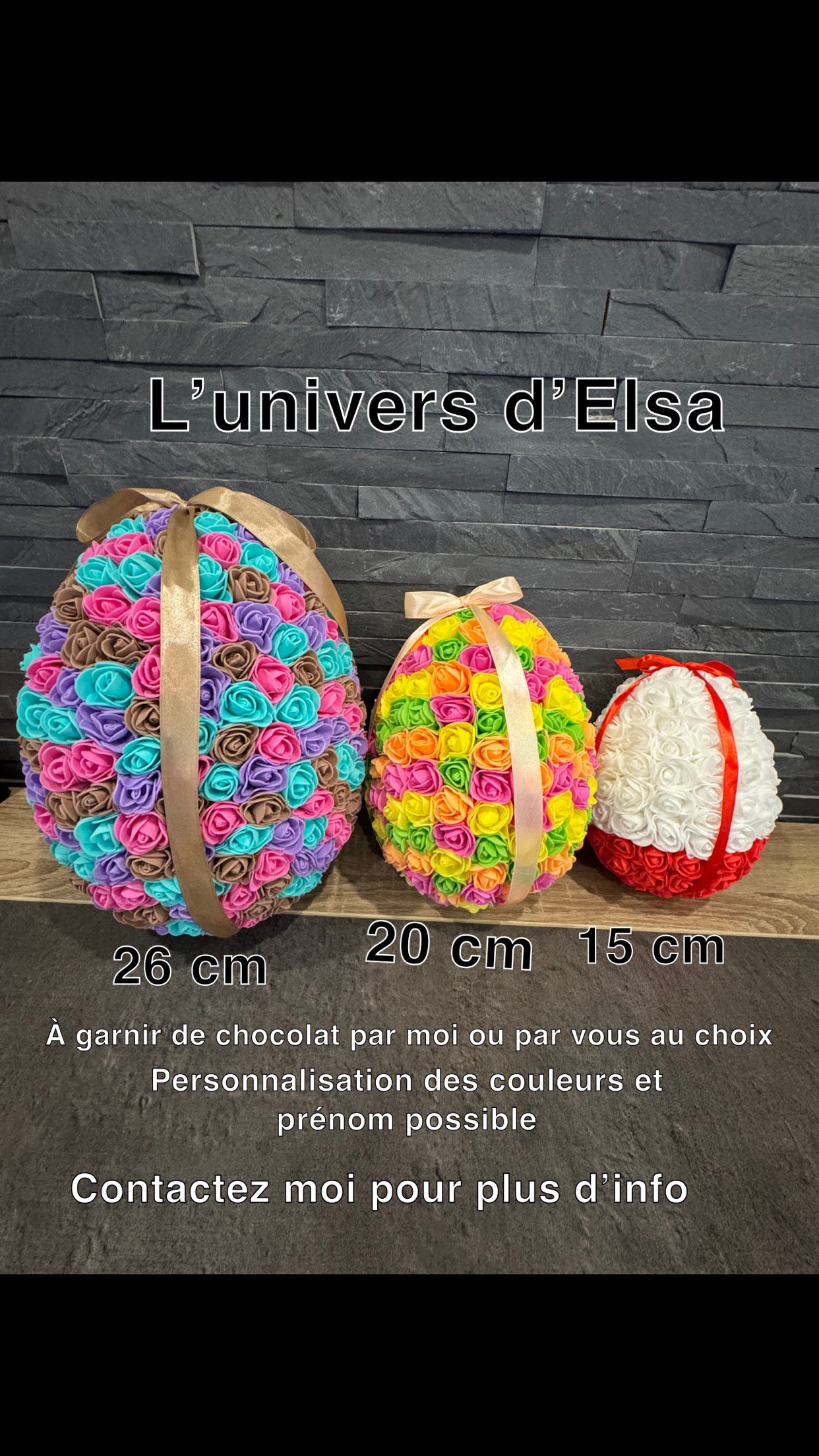 Célébrez Pâques avec un œuf floral personnalisé de 20 cm! Choisissez les couleurs et ajoutez un prénom en lettres en bois. Disponible vide ou rempli de délicieux chocolats ou bonbons. Faites une belle surprise à vos proches avec cet œuf unique et fleuri.