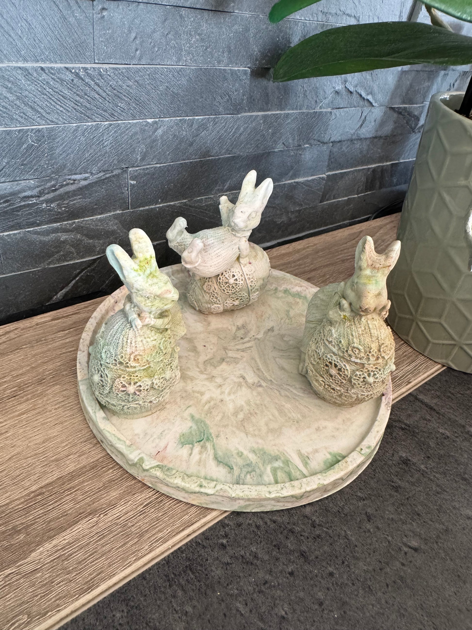 "Adorable Lot de 3 petits lapins, chaque un d'environ 8cm, avec un effet marbré original. Associez-les avec le plateau rond assorti pour une touche de charme supplémentaire. Fabriqués artisanalement avec soin, chaque lapin est unique. Ajoutez-les à votre collection dès maintenant!"